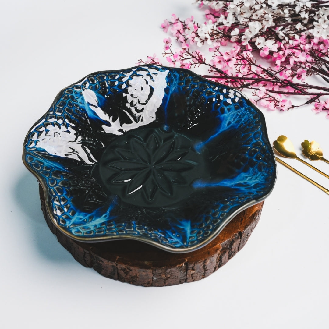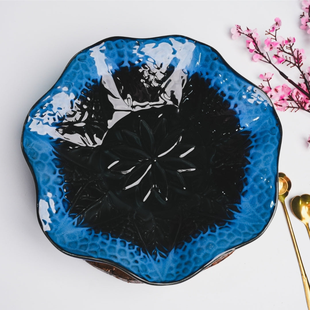 This stunning ceramic plate showcases a mesmerizing black and blue glaze with a floral embossed pattern at the center. The wavy, scalloped edges add an artistic flair, making it a perfect statement piece for serving or display. Its glossy finish enhances the intricate details, adding elegance to any dining setup.